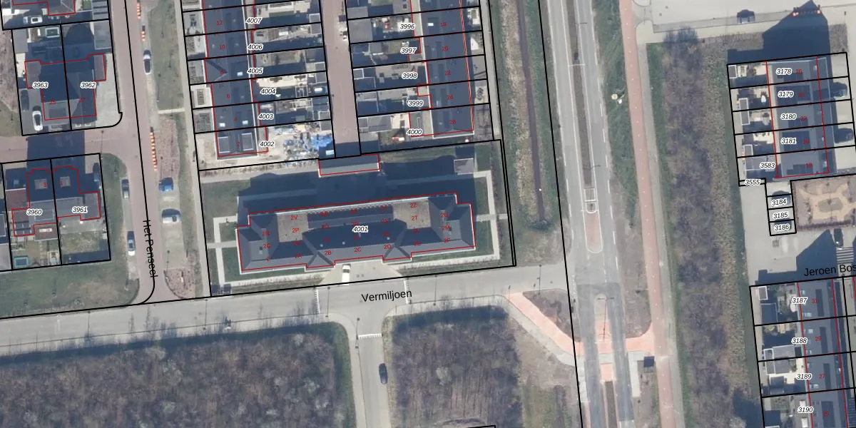 Het perceel waarop Vermiljoen 2-R staat heeft een oppervlakte van 2101 m². Dit is een zeer groot perceel. De perceeloppervlakte wordt geregistreerd door het Kadaster. Gedetailleerde informatie over de maten van dit perceel kunt u vinden in het rapport Kadastrale kaart met maatvoering van Vermiljoen 2-R.