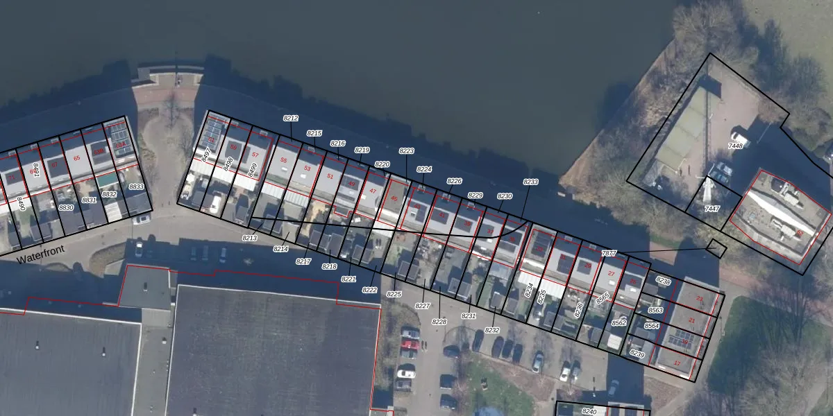 Het perceel waarop Waterfront 43 staat heeft een oppervlakte van 75 m². Dit is een klein perceel. De perceeloppervlakte wordt geregistreerd door het Kadaster. Gedetailleerde informatie over de maten van dit perceel kunt u vinden in het rapport Kadastrale kaart met maatvoering van Waterfront 43.