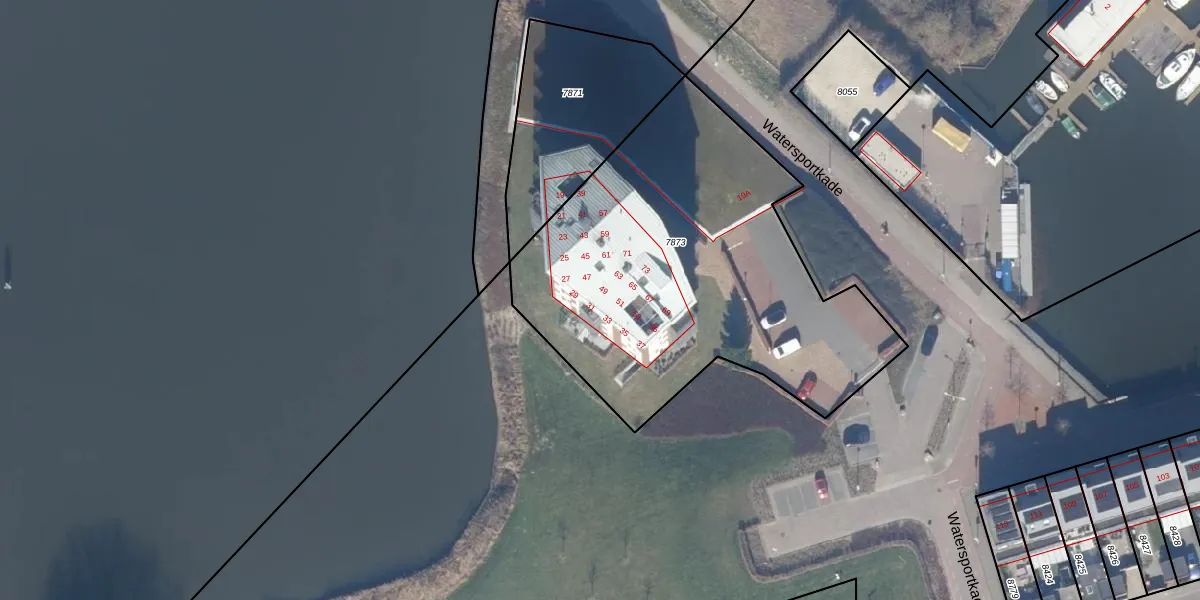 Het perceel waarop Watersportkade 65 staat heeft een oppervlakte van 2045 m². Dit is een zeer groot perceel. De perceeloppervlakte wordt geregistreerd door het Kadaster. Gedetailleerde informatie over de maten van dit perceel kunt u vinden in het rapport Kadastrale kaart met maatvoering van Watersportkade 65.
