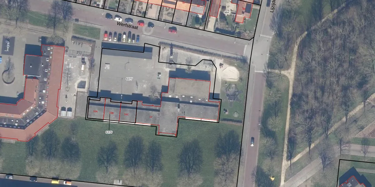 Het perceel waarop Werfstraat 12 staat heeft een oppervlakte van 2145 m². Dit is een zeer groot perceel. De perceeloppervlakte wordt geregistreerd door het Kadaster. Gedetailleerde informatie over de maten van dit perceel kunt u vinden in het rapport Kadastrale kaart met maatvoering van Werfstraat 12.