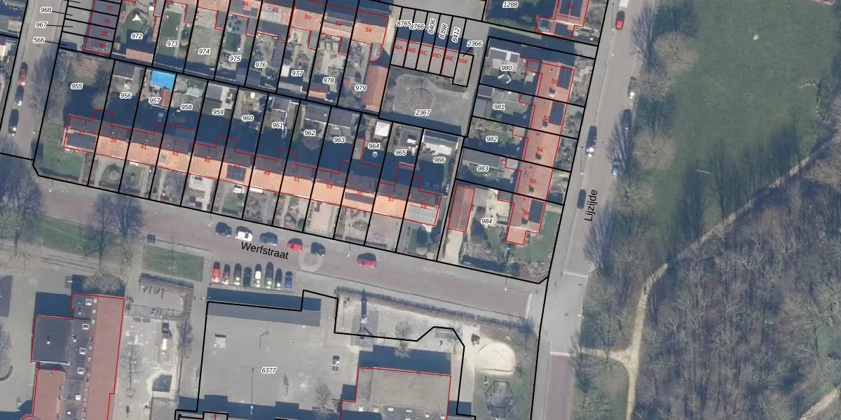 Het perceel waarop Werfstraat 59 staat heeft een oppervlakte van 299 m². Dit is een middelgroot perceel. De perceeloppervlakte wordt geregistreerd door het Kadaster. Gedetailleerde informatie over de maten van dit perceel kunt u vinden in het rapport Kadastrale kaart met maatvoering van Werfstraat 59.