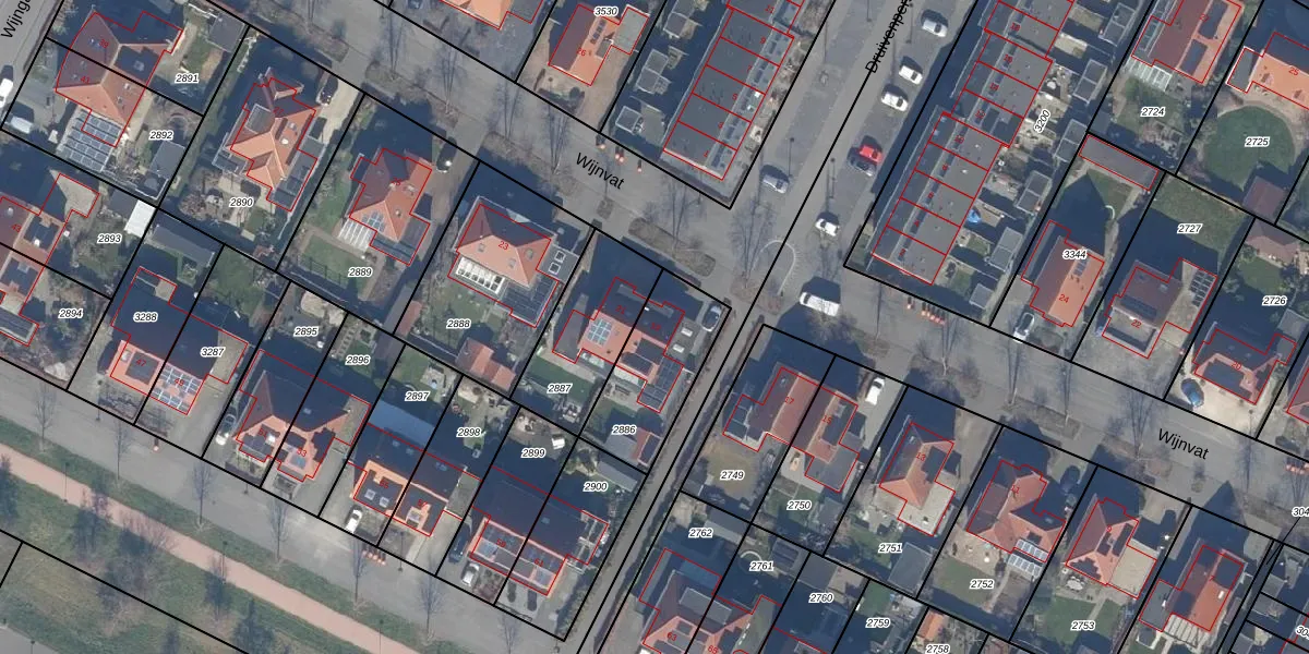 Het perceel waarop Wijnvat 19 staat heeft een oppervlakte van 345 m². Dit is een groot perceel. De perceeloppervlakte wordt geregistreerd door het Kadaster. Gedetailleerde informatie over de maten van dit perceel kunt u vinden in het rapport Kadastrale kaart met maatvoering van Wijnvat 19.