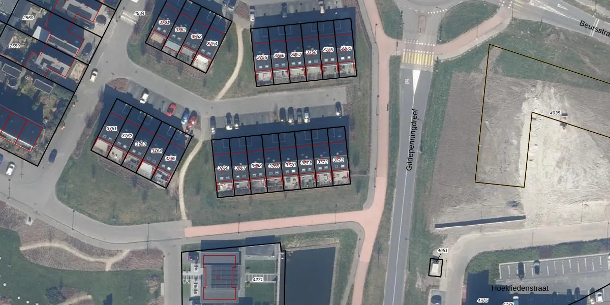 Het adres is gelegen op perceel 3771 in de sectie B en de kadastrale gemeente Dronten. De kadastrale aanduiding is aldus DTN01-B-3771. De gemiddelde perceelgrootte in Dronten is 1,8 ha. Dit perceel is kleiner: de perceeloppervlakte bedraagt 103 m². Het grootste perceel in de kadastrale gemeente is 25,03 km². Het kleinste perceel heeft een oppervlakte van 0 m². Dit is het enige adres dat aanwezig is op het perceel. In de Basisregistratie Kadaster (BRK) werden de grenzen van het perceel geregistreerd op 27-09-2017.