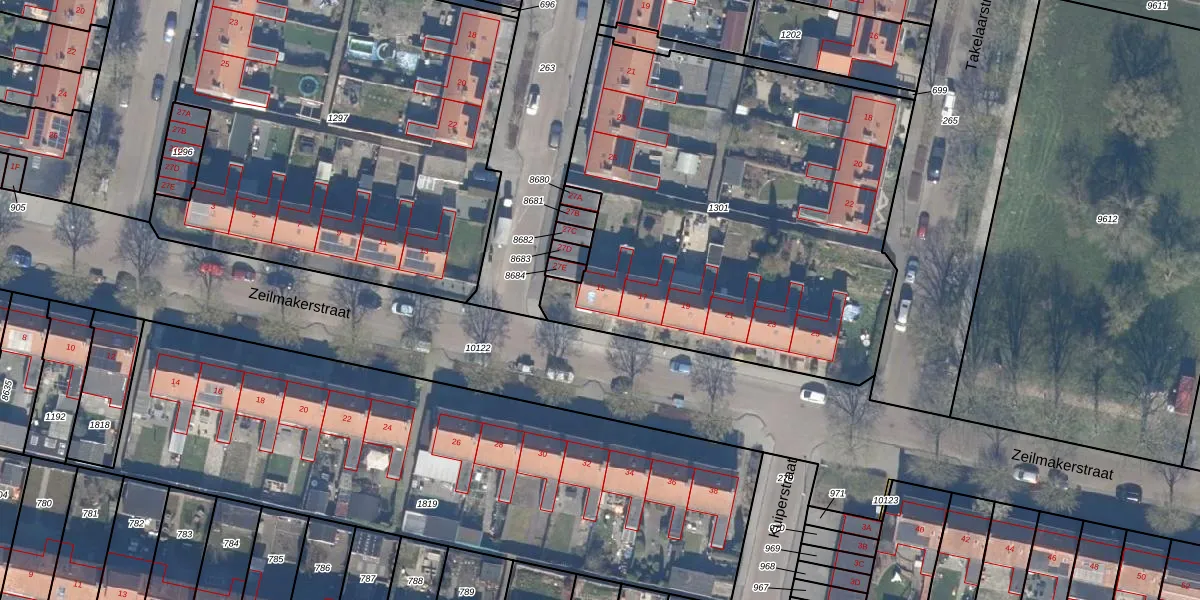 Het perceel waarop Zeilmakerstraat 15 staat heeft een oppervlakte van 2562 m². Dit is een zeer groot perceel. De perceeloppervlakte wordt geregistreerd door het Kadaster. Gedetailleerde informatie over de maten van dit perceel kunt u vinden in het rapport Kadastrale kaart met maatvoering van Zeilmakerstraat 15.