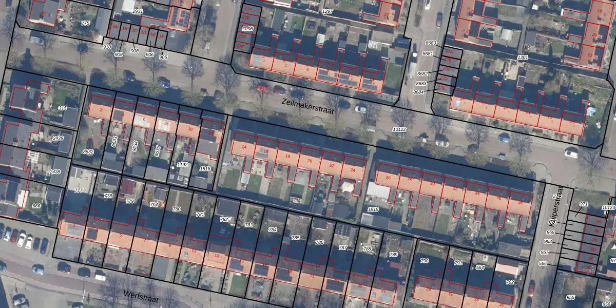 Het perceel waarop Zeilmakerstraat 20 staat heeft een oppervlakte van 2799 m². Dit is een zeer groot perceel. De perceeloppervlakte wordt geregistreerd door het Kadaster. Gedetailleerde informatie over de maten van dit perceel kunt u vinden in het rapport Kadastrale kaart met maatvoering van Zeilmakerstraat 20.