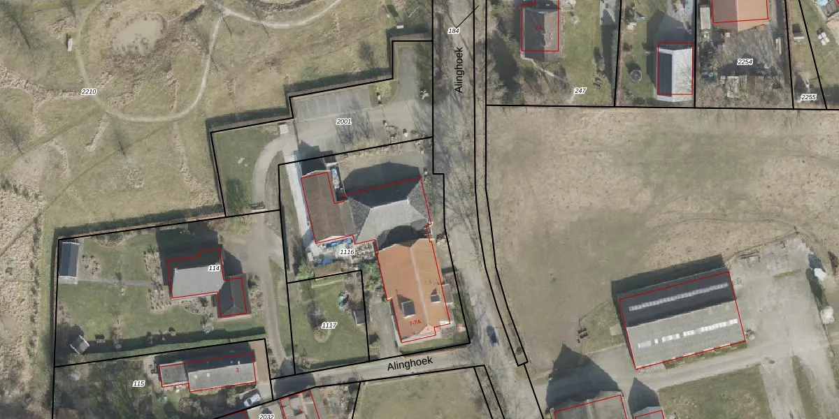Het perceel waarop Alinghoek 7-A staat heeft een oppervlakte van 1605 m². Dit is een zeer groot perceel. De perceeloppervlakte wordt geregistreerd door het Kadaster. Gedetailleerde informatie over de maten van dit perceel kunt u vinden in het rapport Kadastrale kaart met maatvoering van Alinghoek 7-A.