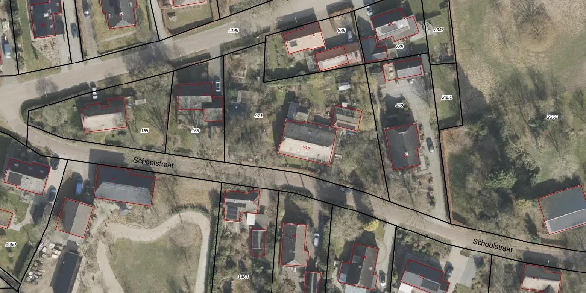 Het perceel waarop Schoolstraat 1 staat heeft een oppervlakte van 1978 m². Dit is een zeer groot perceel. De perceeloppervlakte wordt geregistreerd door het Kadaster. Gedetailleerde informatie over de maten van dit perceel kunt u vinden in het rapport Kadastrale kaart met maatvoering van Schoolstraat 1.