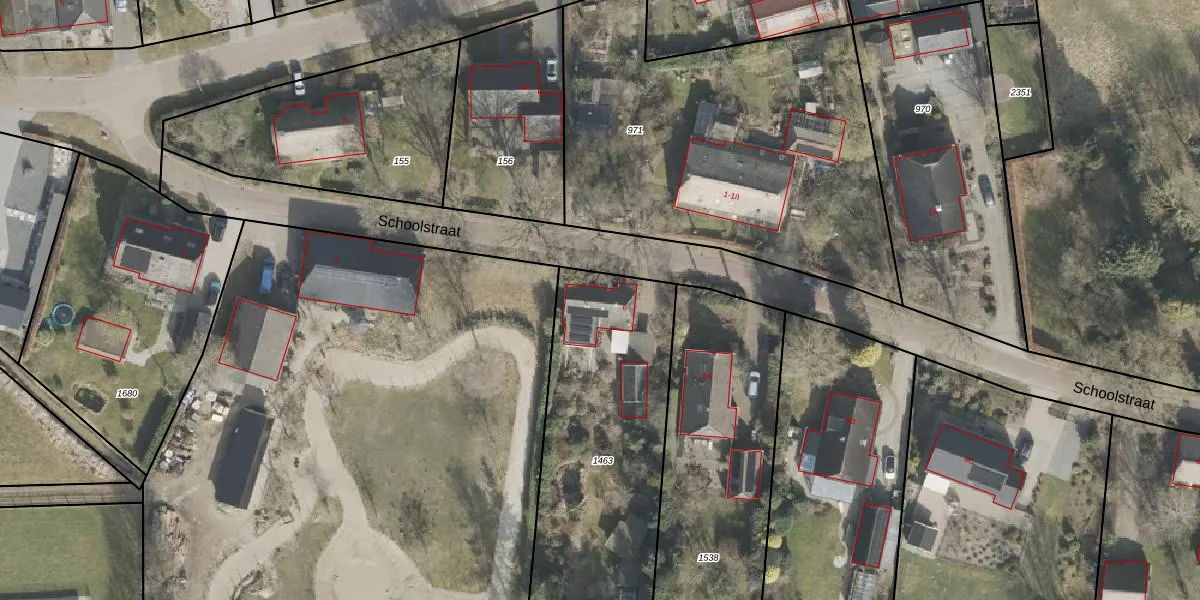 Het perceel waarop Schoolstraat 6 staat heeft een oppervlakte van 1435 m². Dit is een zeer groot perceel. De perceeloppervlakte wordt geregistreerd door het Kadaster. Gedetailleerde informatie over de maten van dit perceel kunt u vinden in het rapport Kadastrale kaart met maatvoering van Schoolstraat 6.