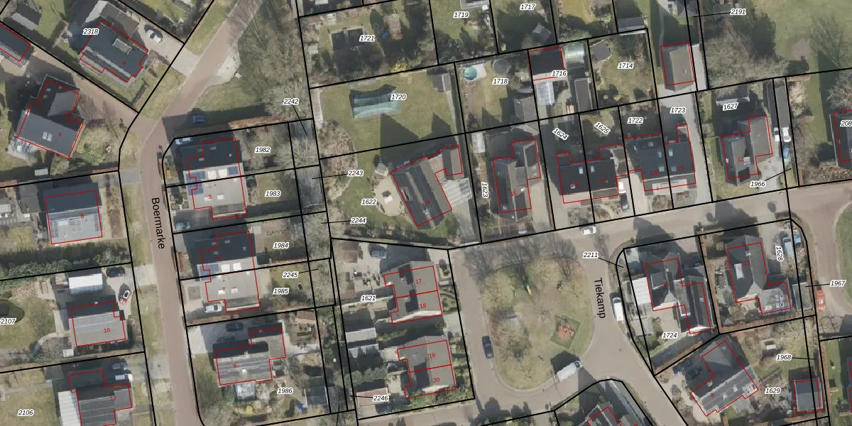 Het perceel waarop Tiekamp 16 staat heeft een oppervlakte van 812 m². Dit is een groot perceel. De perceeloppervlakte wordt geregistreerd door het Kadaster. Gedetailleerde informatie over de maten van dit perceel kunt u vinden in het rapport Kadastrale kaart met maatvoering van Tiekamp 16.
