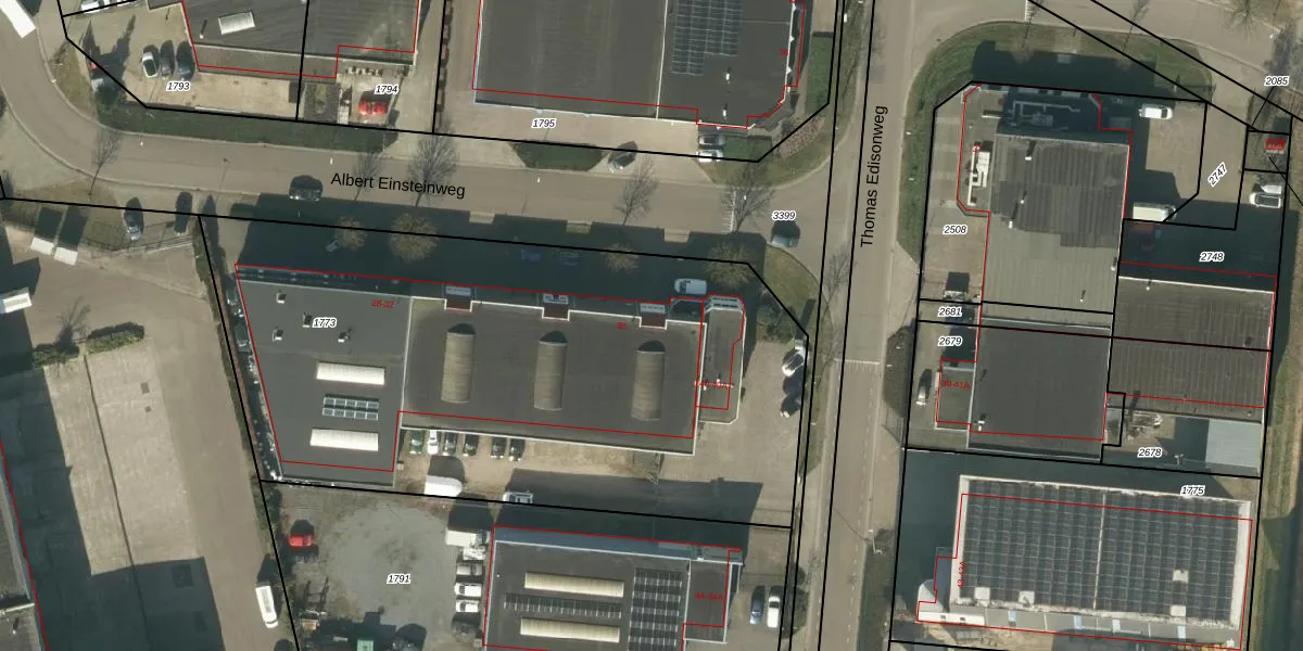 Het perceel waarop Albert Einsteinweg 36 staat heeft een oppervlakte van 3475 m². Dit is een zeer groot perceel. De perceeloppervlakte wordt geregistreerd door het Kadaster. Gedetailleerde informatie over de maten van dit perceel kunt u vinden in het rapport Kadastrale kaart met maatvoering van Albert Einsteinweg 36.