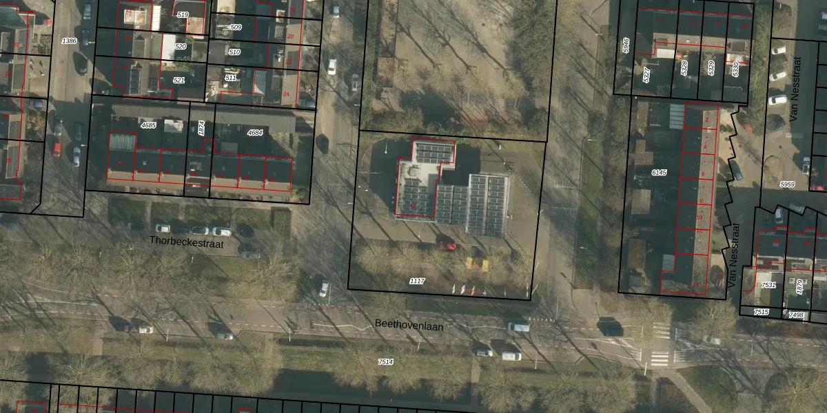 Het perceel waarop Beethovenlaan 17 staat heeft een oppervlakte van 1713 m². Dit is een zeer groot perceel. De perceeloppervlakte wordt geregistreerd door het Kadaster. Gedetailleerde informatie over de maten van dit perceel kunt u vinden in het rapport Kadastrale kaart met maatvoering van Beethovenlaan 17.
