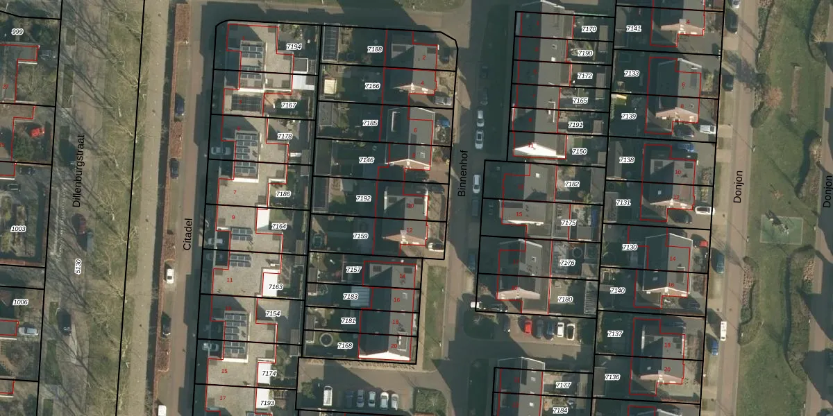 Binnenhof 10 is gelegen op kadastraal perceel DNN00L7192. Deze kadastrale aanduiding is uniek en wordt gebruikt door het Kadaster om eigendomsrechten en andere zakelijke rechten vast te leggen. Het perceel maakt onderdeel uit van de kadastrale gemeente Drunen.