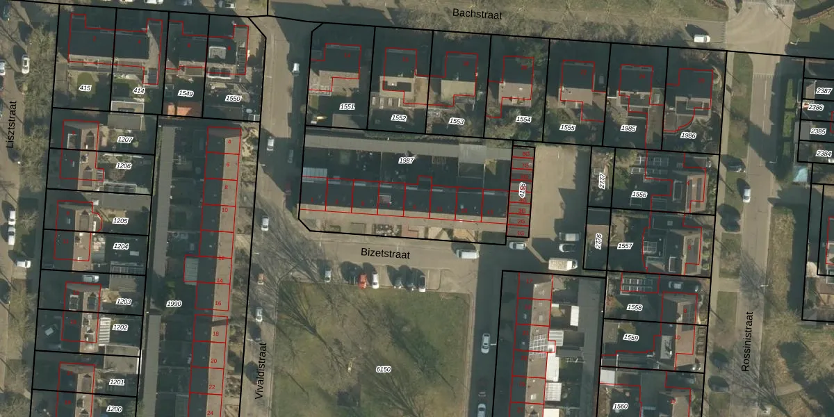 Het perceel waarop Bizetstraat 9 staat heeft een oppervlakte van 1249 m². Dit is een zeer groot perceel. De perceeloppervlakte wordt geregistreerd door het Kadaster. Gedetailleerde informatie over de maten van dit perceel kunt u vinden in het rapport Kadastrale kaart met maatvoering van Bizetstraat 9.