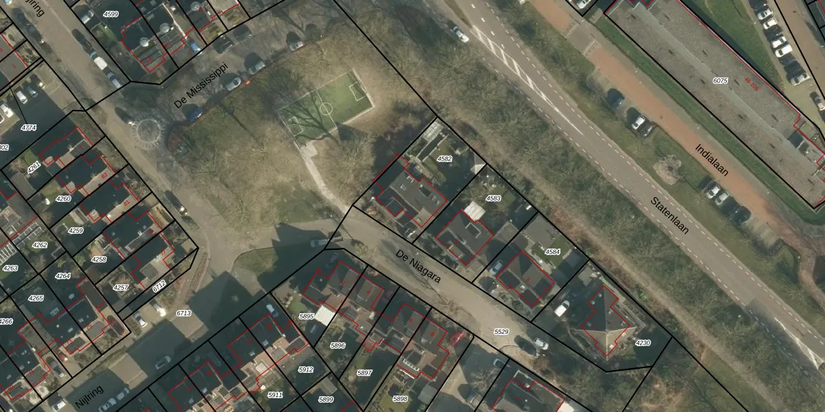 Het perceel waarop De Niagara 1 staat heeft een oppervlakte van 480 m². Dit is een groot perceel. De perceeloppervlakte wordt geregistreerd door het Kadaster. Gedetailleerde informatie over de maten van dit perceel kunt u vinden in het rapport Kadastrale kaart met maatvoering van De Niagara 1.