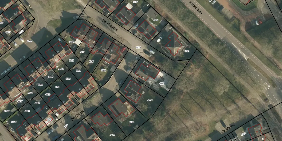 Het perceel waarop De Niagara 9 staat heeft een oppervlakte van 465 m². Dit is een groot perceel. De perceeloppervlakte wordt geregistreerd door het Kadaster. Gedetailleerde informatie over de maten van dit perceel kunt u vinden in het rapport Kadastrale kaart met maatvoering van De Niagara 9.