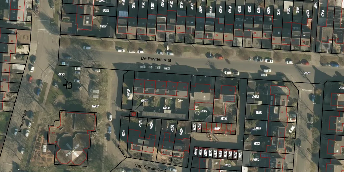 Het perceel waarop De Ruyterstraat 18 staat heeft een oppervlakte van 875 m². Dit is een groot perceel. De perceeloppervlakte wordt geregistreerd door het Kadaster. Gedetailleerde informatie over de maten van dit perceel kunt u vinden in het rapport Kadastrale kaart met maatvoering van De Ruyterstraat 18.