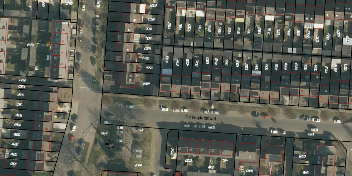Het perceel waarop De Ruyterstraat 3 staat heeft een oppervlakte van 163 m². Dit is een middelgroot perceel. De perceeloppervlakte wordt geregistreerd door het Kadaster. Gedetailleerde informatie over de maten van dit perceel kunt u vinden in het rapport Kadastrale kaart met maatvoering van De Ruyterstraat 3.