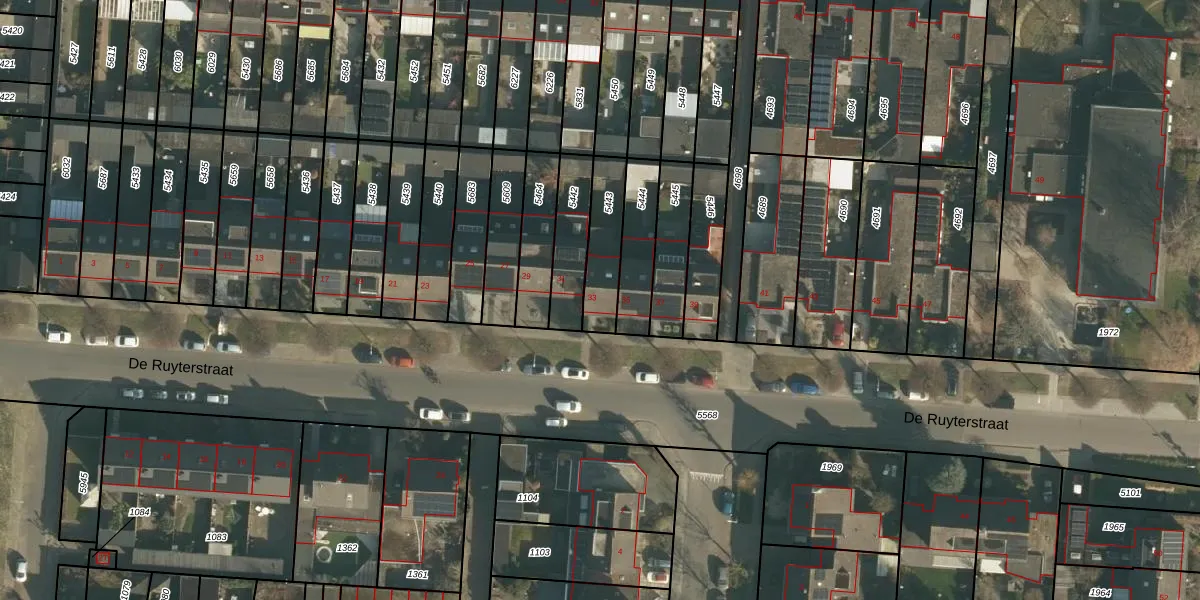 Het perceel waarop De Ruyterstraat 33 staat heeft een oppervlakte van 165 m². Dit is een middelgroot perceel. De perceeloppervlakte wordt geregistreerd door het Kadaster. Gedetailleerde informatie over de maten van dit perceel kunt u vinden in het rapport Kadastrale kaart met maatvoering van De Ruyterstraat 33.