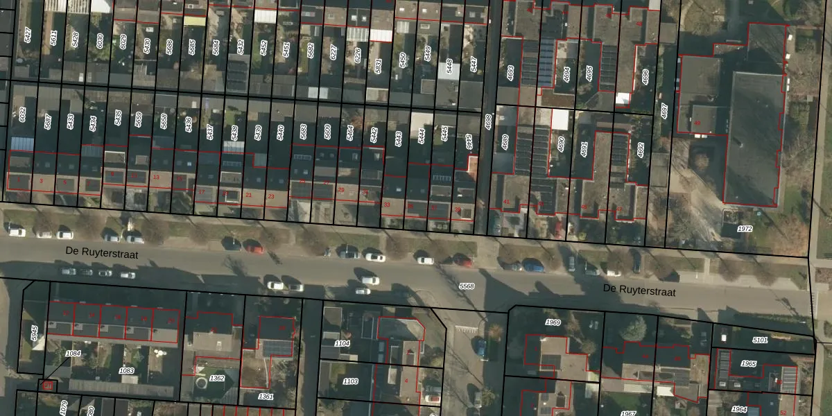 Het perceel waarop De Ruyterstraat 35 staat heeft een oppervlakte van 165 m². Dit is een middelgroot perceel. De perceeloppervlakte wordt geregistreerd door het Kadaster. Gedetailleerde informatie over de maten van dit perceel kunt u vinden in het rapport Kadastrale kaart met maatvoering van De Ruyterstraat 35.