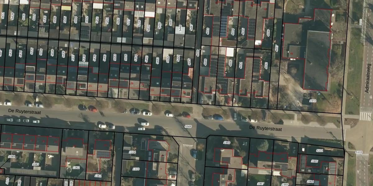 Het perceel waarop De Ruyterstraat 39 staat heeft een oppervlakte van 169 m². Dit is een middelgroot perceel. De perceeloppervlakte wordt geregistreerd door het Kadaster. Gedetailleerde informatie over de maten van dit perceel kunt u vinden in het rapport Kadastrale kaart met maatvoering van De Ruyterstraat 39.