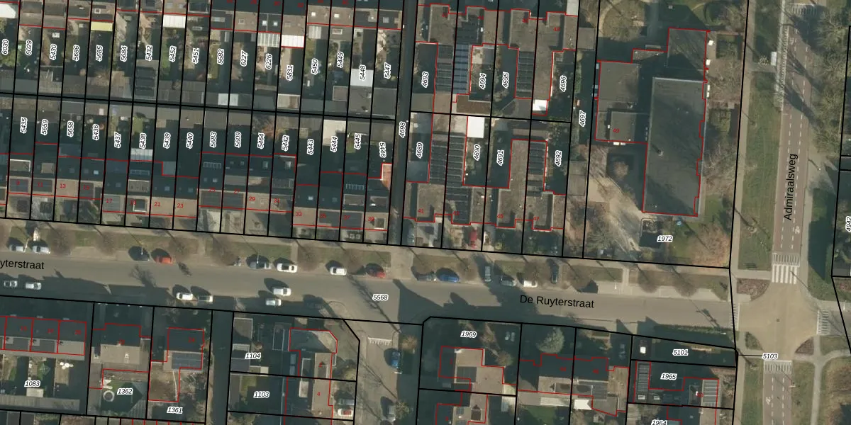 De Ruyterstraat 41 is gelegen op kadastraal perceel DNN00L4689. Deze kadastrale aanduiding is uniek en wordt gebruikt door het Kadaster om eigendomsrechten en andere zakelijke rechten vast te leggen. Het perceel maakt onderdeel uit van de kadastrale gemeente Drunen.