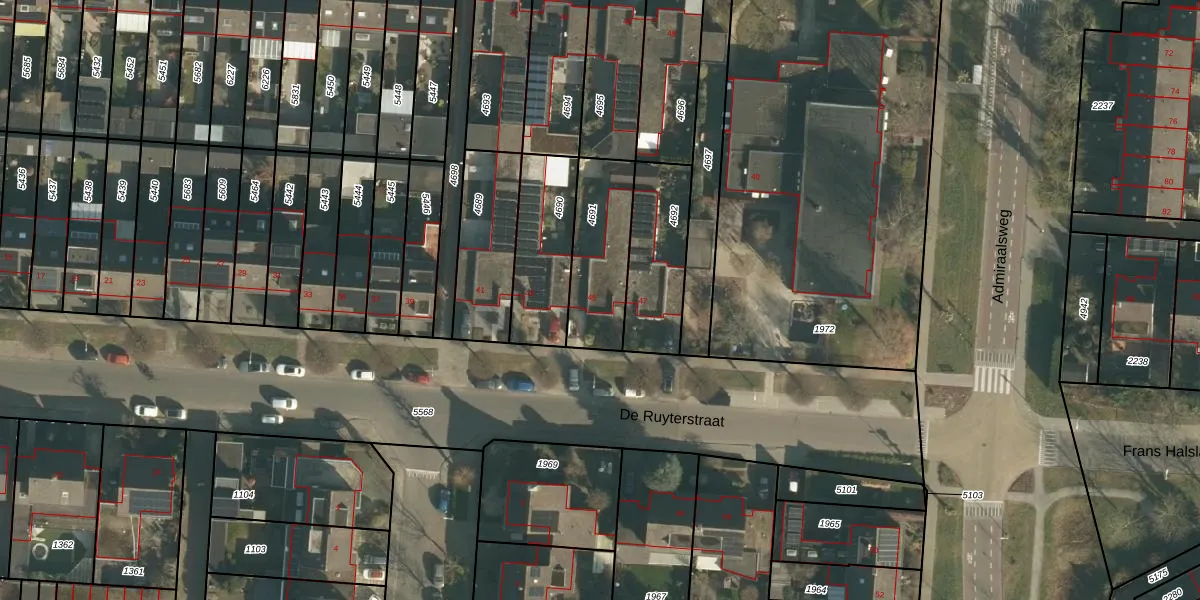 De Ruyterstraat 45 is gelegen op kadastraal perceel DNN00L4691. Deze kadastrale aanduiding is uniek en wordt gebruikt door het Kadaster om eigendomsrechten en andere zakelijke rechten vast te leggen. Het perceel maakt onderdeel uit van de kadastrale gemeente Drunen.