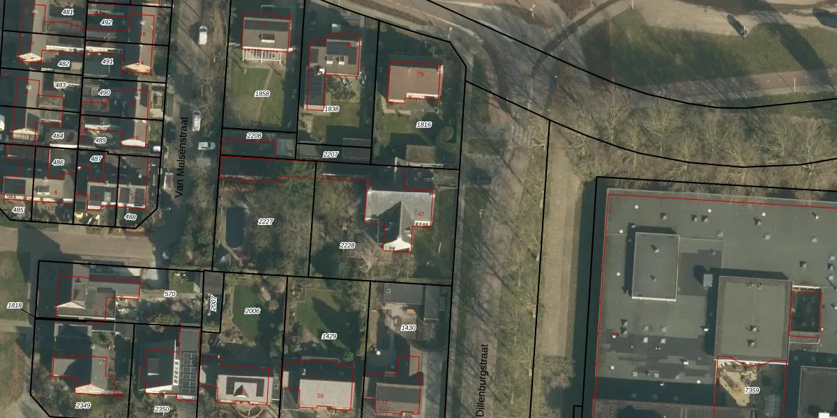 Dillenburgstraat 47 is gelegen op kadastraal perceel DNN00H2228. Deze kadastrale aanduiding is uniek en wordt gebruikt door het Kadaster om eigendomsrechten en andere zakelijke rechten vast te leggen. Het perceel maakt onderdeel uit van de kadastrale gemeente Drunen.