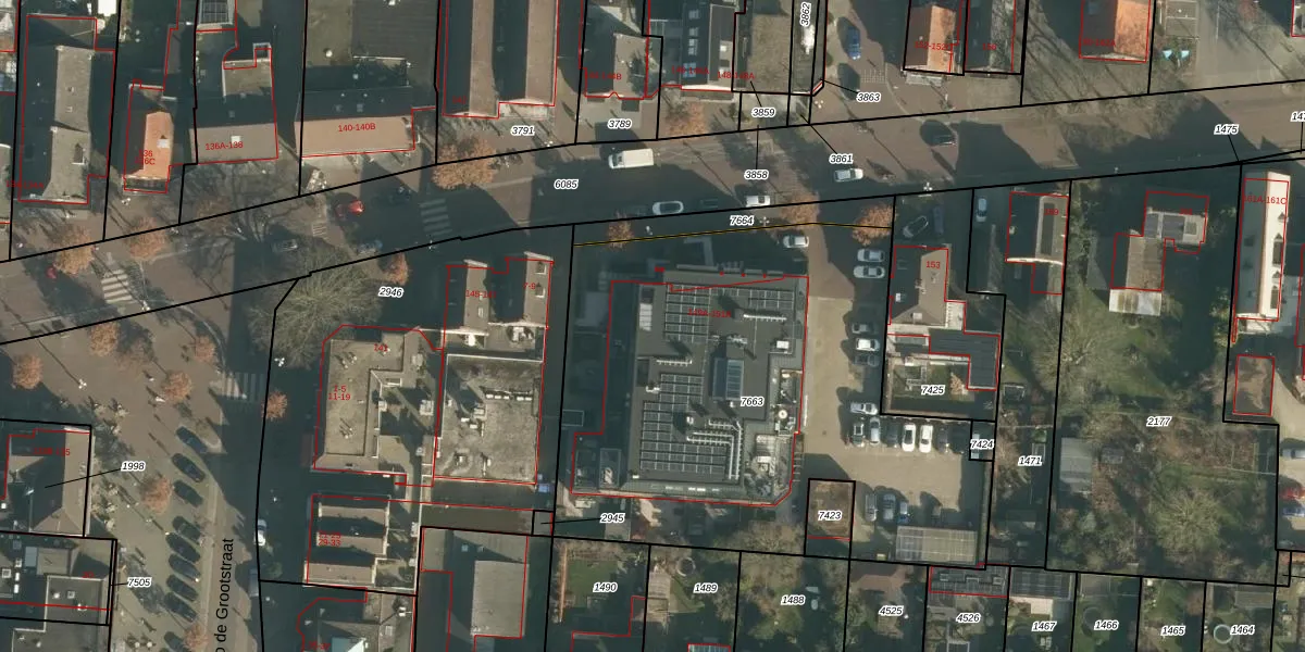 Het perceel waarop Grotestraat 151-F staat heeft een oppervlakte van 2668 m². Dit is een zeer groot perceel. De perceeloppervlakte wordt geregistreerd door het Kadaster. Gedetailleerde informatie over de maten van dit perceel kunt u vinden in het rapport Kadastrale kaart met maatvoering van Grotestraat 151-F.