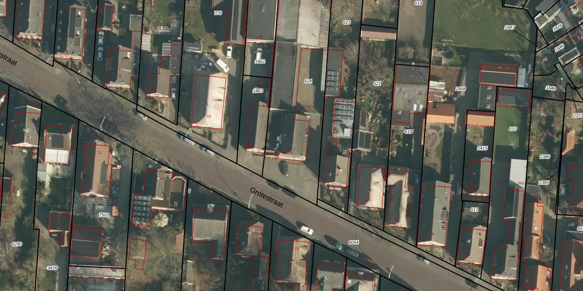 Het perceel waarop Grotestraat 16-A staat heeft een oppervlakte van 1315 m². Dit is een zeer groot perceel. De perceeloppervlakte wordt geregistreerd door het Kadaster. Gedetailleerde informatie over de maten van dit perceel kunt u vinden in het rapport Kadastrale kaart met maatvoering van Grotestraat 16-A.