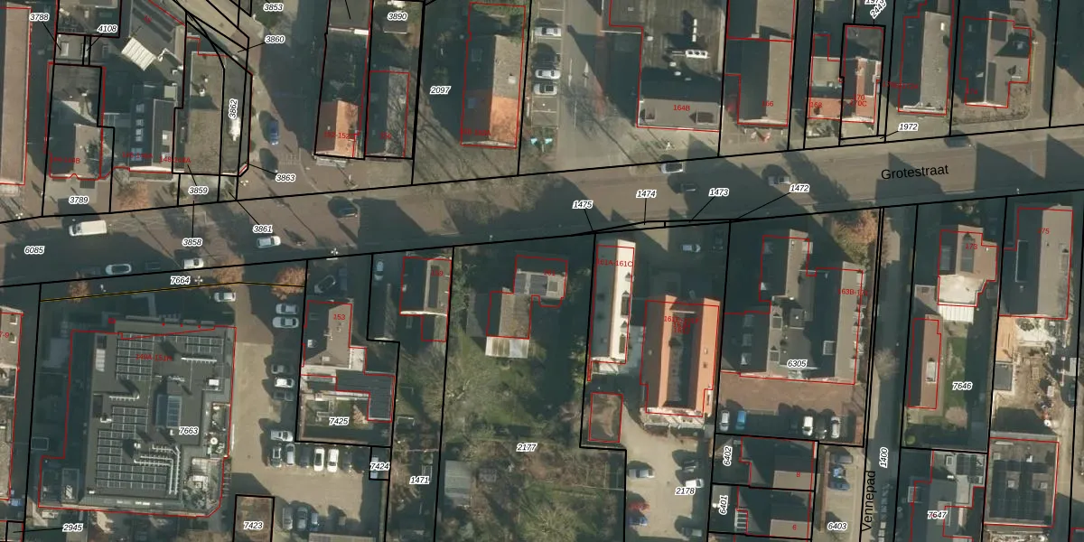 Het perceel waarop Grotestraat 161 staat heeft een oppervlakte van 1819 m². Dit is een zeer groot perceel. De perceeloppervlakte wordt geregistreerd door het Kadaster. Gedetailleerde informatie over de maten van dit perceel kunt u vinden in het rapport Kadastrale kaart met maatvoering van Grotestraat 161.