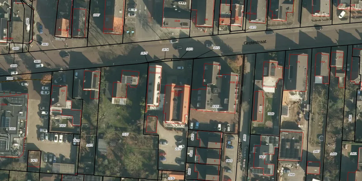 Het perceel waarop Grotestraat 161-C staat heeft een oppervlakte van 1306 m². Dit is een zeer groot perceel. De perceeloppervlakte wordt geregistreerd door het Kadaster. Gedetailleerde informatie over de maten van dit perceel kunt u vinden in het rapport Kadastrale kaart met maatvoering van Grotestraat 161-C.