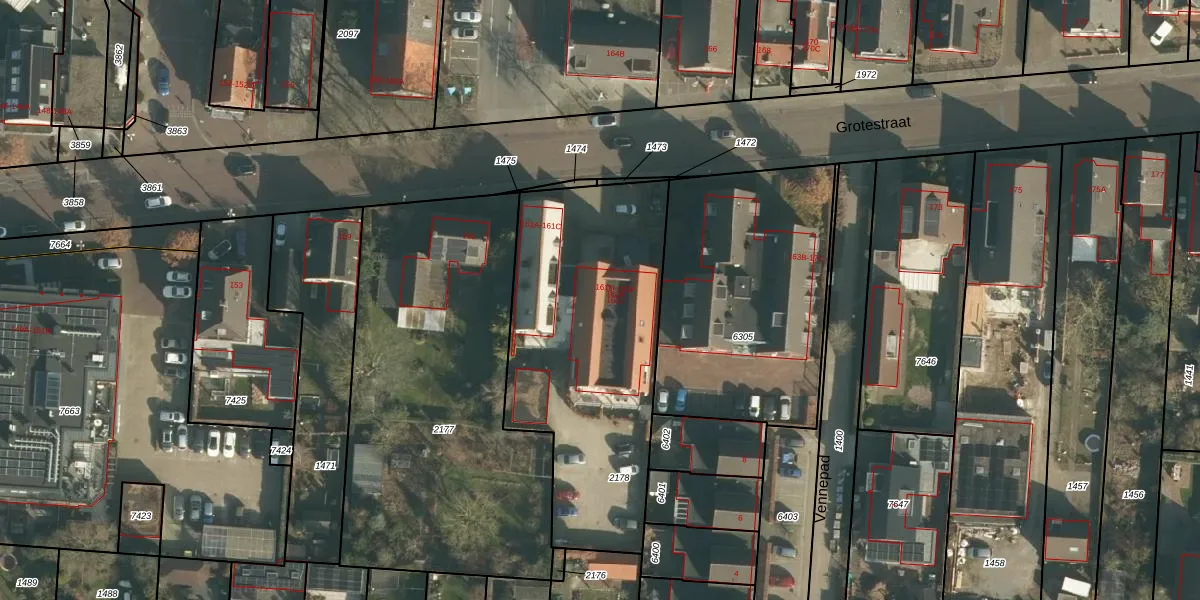 Het perceel waarop Grotestraat 161-E staat heeft een oppervlakte van 1306 m². Dit is een zeer groot perceel. De perceeloppervlakte wordt geregistreerd door het Kadaster. Gedetailleerde informatie over de maten van dit perceel kunt u vinden in het rapport Kadastrale kaart met maatvoering van Grotestraat 161-E.