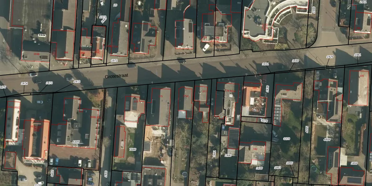 Het perceel waarop Grotestraat 175-A staat heeft een oppervlakte van 804 m². Dit is een groot perceel. De perceeloppervlakte wordt geregistreerd door het Kadaster. Gedetailleerde informatie over de maten van dit perceel kunt u vinden in het rapport Kadastrale kaart met maatvoering van Grotestraat 175-A.