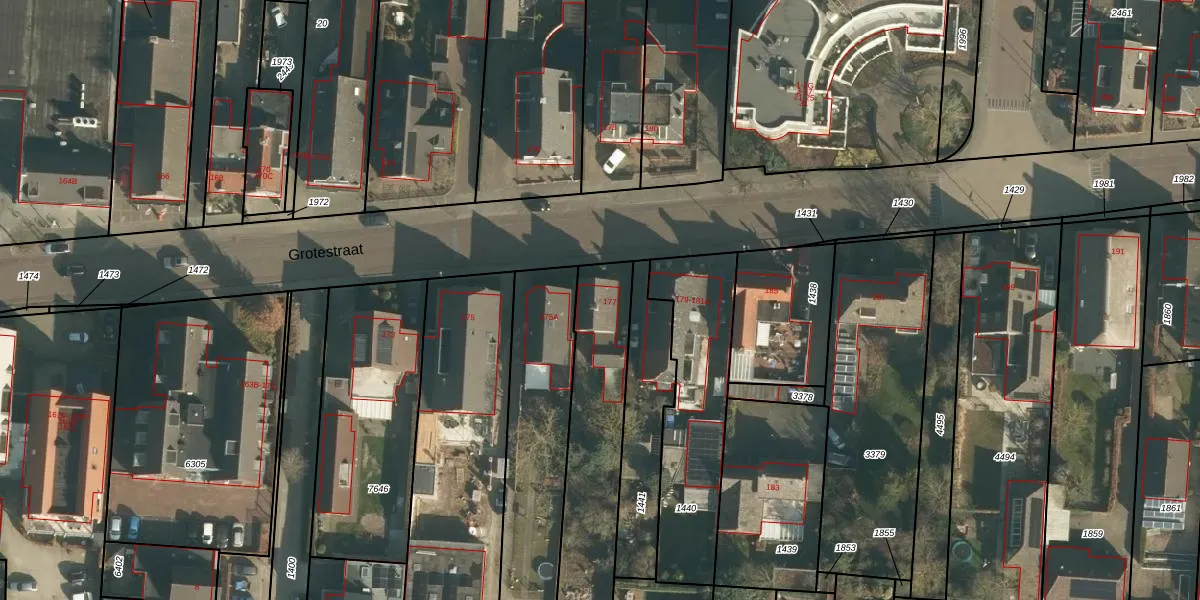 Het perceel waarop Grotestraat 177 staat heeft een oppervlakte van 750 m². Dit is een groot perceel. De perceeloppervlakte wordt geregistreerd door het Kadaster. Gedetailleerde informatie over de maten van dit perceel kunt u vinden in het rapport Kadastrale kaart met maatvoering van Grotestraat 177.