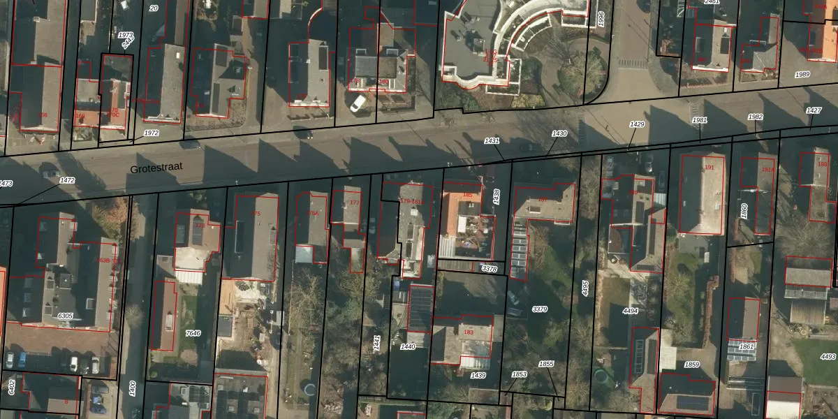 Het perceel waarop Grotestraat 181-A staat heeft een oppervlakte van 560 m². Dit is een groot perceel. De perceeloppervlakte wordt geregistreerd door het Kadaster. Gedetailleerde informatie over de maten van dit perceel kunt u vinden in het rapport Kadastrale kaart met maatvoering van Grotestraat 181-A.