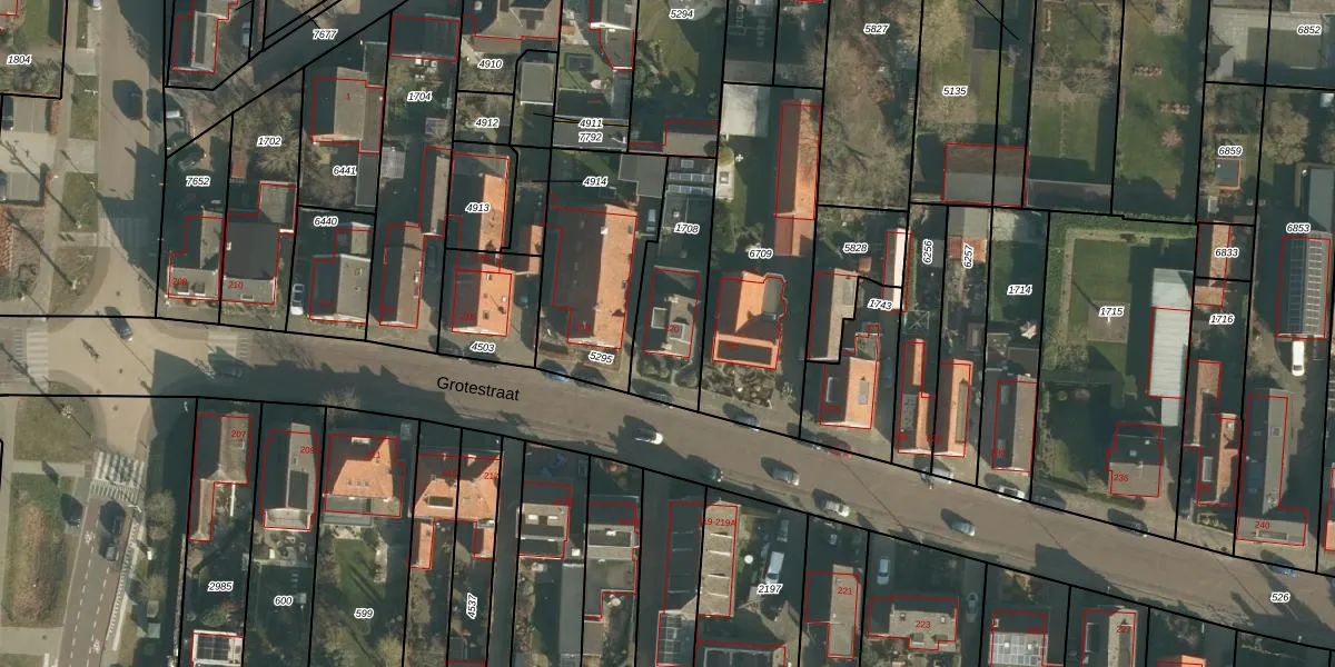 Het perceel waarop Grotestraat 220 staat heeft een oppervlakte van 344 m². Dit is een groot perceel. De perceeloppervlakte wordt geregistreerd door het Kadaster. Gedetailleerde informatie over de maten van dit perceel kunt u vinden in het rapport Kadastrale kaart met maatvoering van Grotestraat 220.