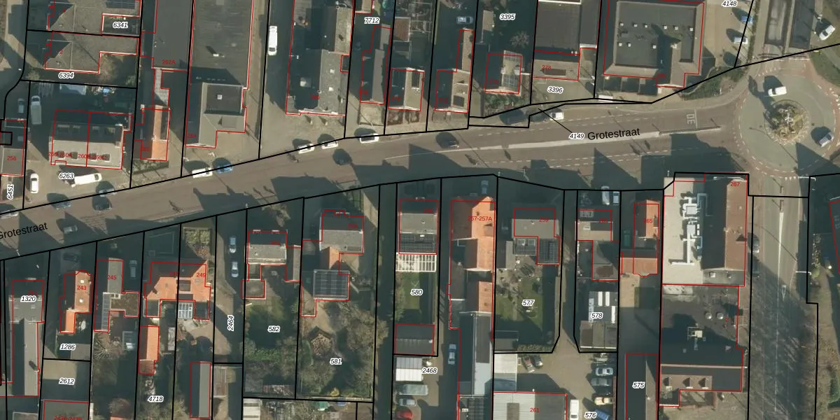 Het perceel waarop Grotestraat 255 staat heeft een oppervlakte van 430 m². Dit is een groot perceel. De perceeloppervlakte wordt geregistreerd door het Kadaster. Gedetailleerde informatie over de maten van dit perceel kunt u vinden in het rapport Kadastrale kaart met maatvoering van Grotestraat 255.