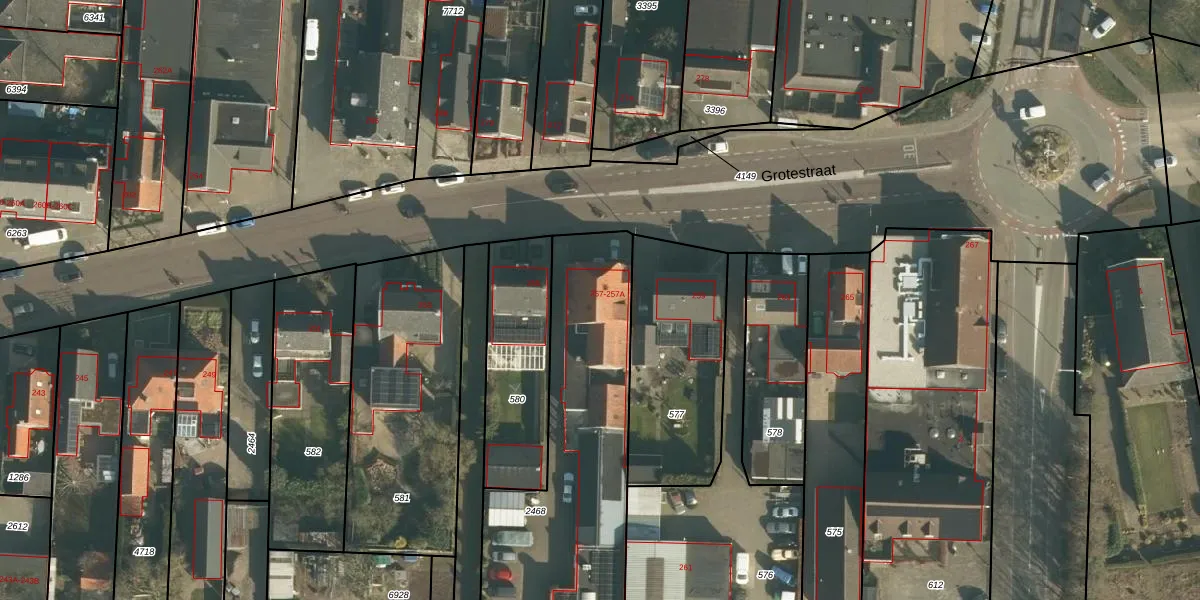 Het perceel waarop Grotestraat 257-A staat heeft een oppervlakte van 1496 m². Dit is een zeer groot perceel. De perceeloppervlakte wordt geregistreerd door het Kadaster. Gedetailleerde informatie over de maten van dit perceel kunt u vinden in het rapport Kadastrale kaart met maatvoering van Grotestraat 257-A.