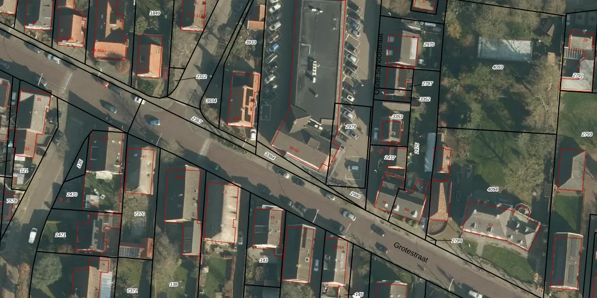 Het perceel waarop Grotestraat 50 staat heeft een oppervlakte van 2205 m². Dit is een zeer groot perceel. De perceeloppervlakte wordt geregistreerd door het Kadaster. Gedetailleerde informatie over de maten van dit perceel kunt u vinden in het rapport Kadastrale kaart met maatvoering van Grotestraat 50.