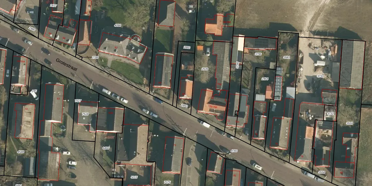 Het perceel waarop Grotestraat 66 staat heeft een oppervlakte van 251 m². Dit is een middelgroot perceel. De perceeloppervlakte wordt geregistreerd door het Kadaster. Gedetailleerde informatie over de maten van dit perceel kunt u vinden in het rapport Kadastrale kaart met maatvoering van Grotestraat 66.