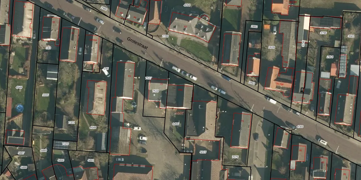 Het perceel waarop Grotestraat 69-A staat heeft een oppervlakte van 475 m². Dit is een groot perceel. De perceeloppervlakte wordt geregistreerd door het Kadaster. Gedetailleerde informatie over de maten van dit perceel kunt u vinden in het rapport Kadastrale kaart met maatvoering van Grotestraat 69-A.