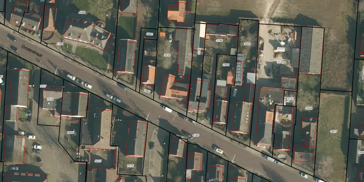 Het perceel waarop Grotestraat 70-E staat heeft een oppervlakte van 860 m². Dit is een groot perceel. De perceeloppervlakte wordt geregistreerd door het Kadaster. Gedetailleerde informatie over de maten van dit perceel kunt u vinden in het rapport Kadastrale kaart met maatvoering van Grotestraat 70-E.