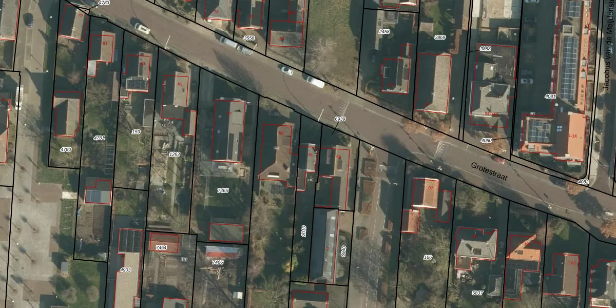 Het perceel waarop Grotestraat 91 staat heeft een oppervlakte van 357 m². Dit is een groot perceel. De perceeloppervlakte wordt geregistreerd door het Kadaster. Gedetailleerde informatie over de maten van dit perceel kunt u vinden in het rapport Kadastrale kaart met maatvoering van Grotestraat 91.