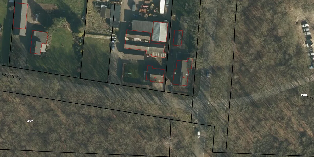 Het perceel waarop Hoge Schijf 2-A staat heeft een oppervlakte van 5015 m². Dit is een zeer groot perceel. De perceeloppervlakte wordt geregistreerd door het Kadaster. Gedetailleerde informatie over de maten van dit perceel kunt u vinden in het rapport Kadastrale kaart met maatvoering van Hoge Schijf 2-A.