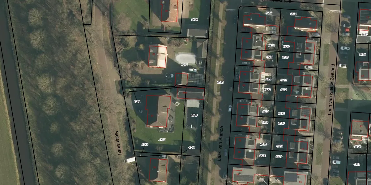 Het perceel waarop Molensteeg 24-A staat heeft een oppervlakte van 1030 m². Dit is een zeer groot perceel. De perceeloppervlakte wordt geregistreerd door het Kadaster. Gedetailleerde informatie over de maten van dit perceel kunt u vinden in het rapport Kadastrale kaart met maatvoering van Molensteeg 24-A.