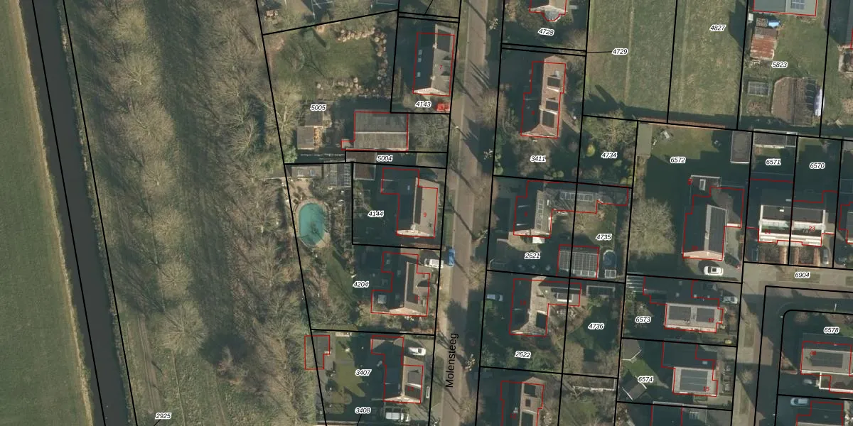 Het perceel waarop Molensteeg 9 staat heeft een oppervlakte van 414 m². Dit is een groot perceel. De perceeloppervlakte wordt geregistreerd door het Kadaster. Gedetailleerde informatie over de maten van dit perceel kunt u vinden in het rapport Kadastrale kaart met maatvoering van Molensteeg 9.