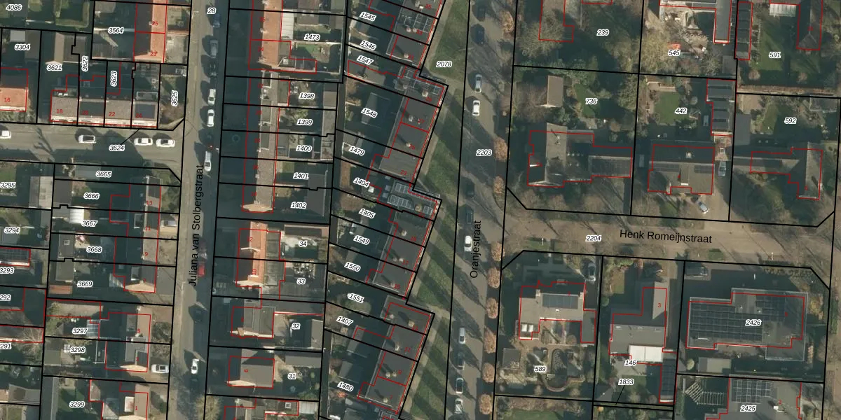 Het perceel waarop Oranjestraat 21 staat heeft een oppervlakte van 174 m². Dit is een middelgroot perceel. De perceeloppervlakte wordt geregistreerd door het Kadaster. Gedetailleerde informatie over de maten van dit perceel kunt u vinden in het rapport Kadastrale kaart met maatvoering van Oranjestraat 21.