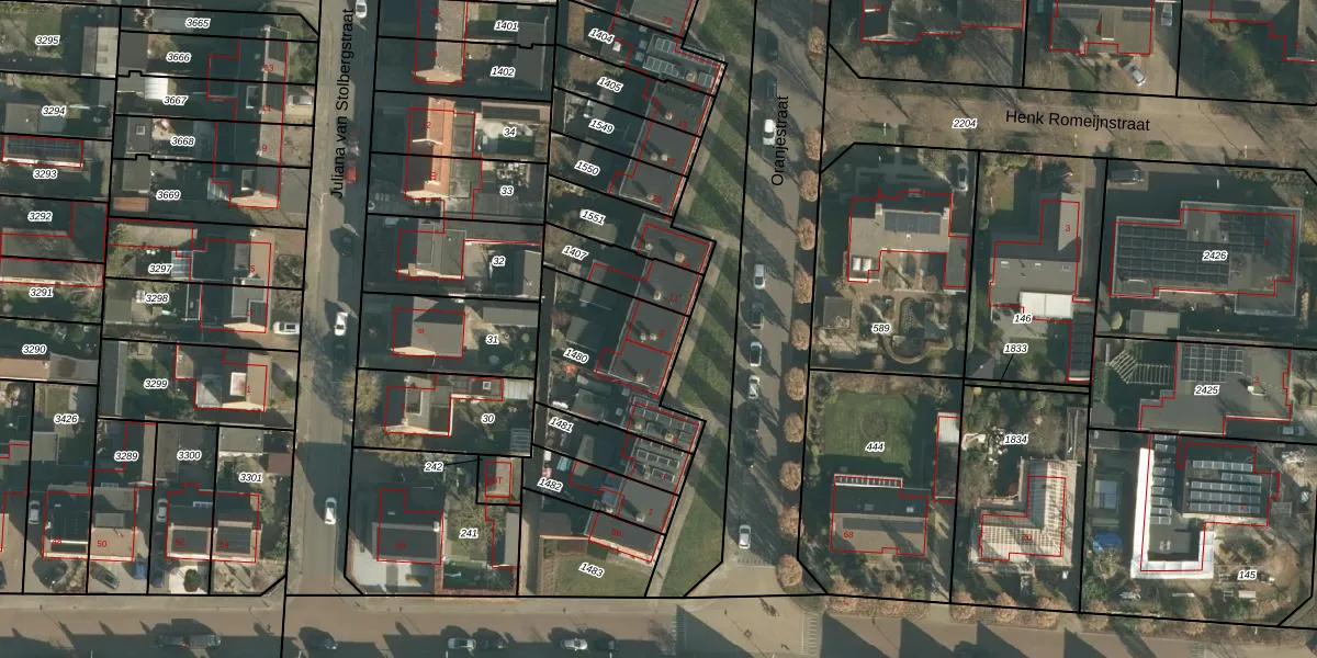 Het perceel waarop Oranjestraat 9 staat heeft een oppervlakte van 459 m². Dit is een groot perceel. De perceeloppervlakte wordt geregistreerd door het Kadaster. Gedetailleerde informatie over de maten van dit perceel kunt u vinden in het rapport Kadastrale kaart met maatvoering van Oranjestraat 9.