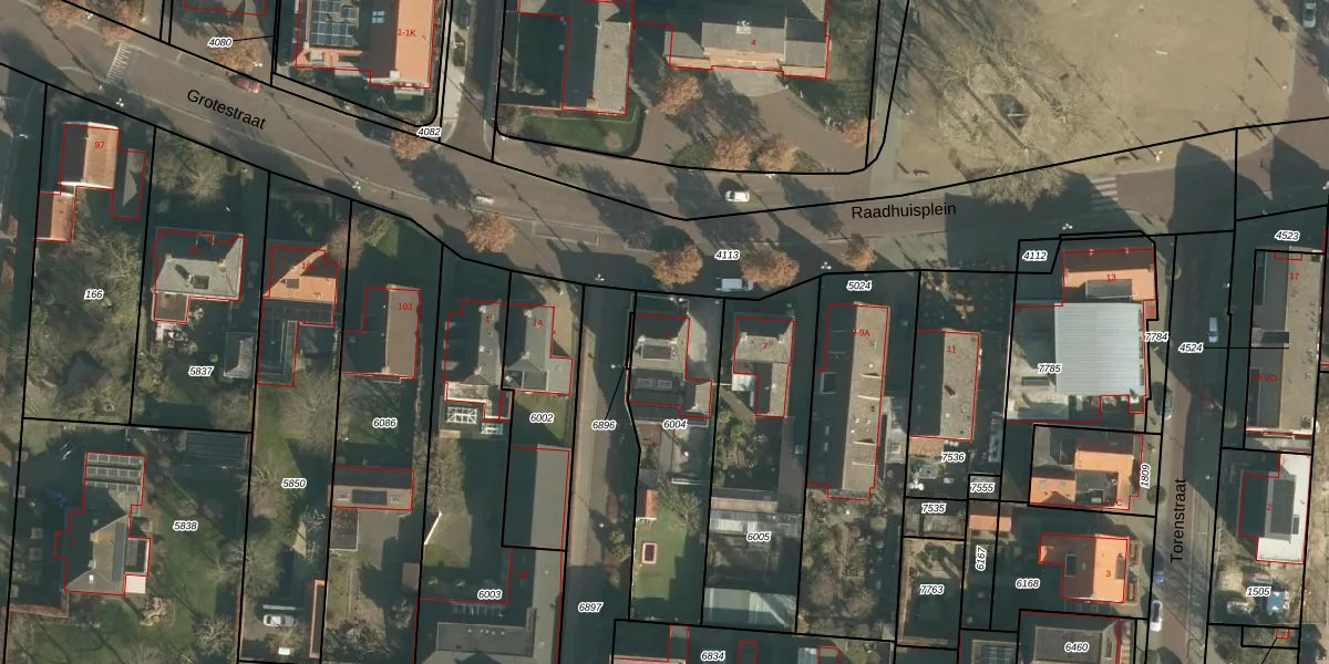 Het perceel waarop Raadhuisplein 5 staat heeft een oppervlakte van 595 m². Dit is een groot perceel. De perceeloppervlakte wordt geregistreerd door het Kadaster. Gedetailleerde informatie over de maten van dit perceel kunt u vinden in het rapport Kadastrale kaart met maatvoering van Raadhuisplein 5.