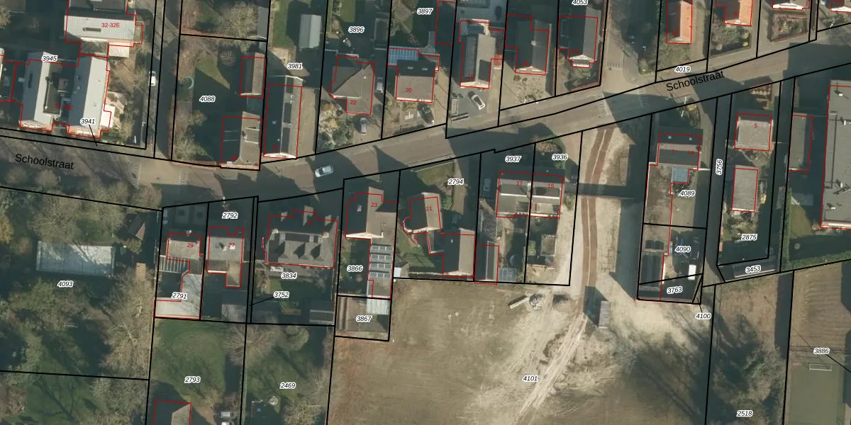 Het perceel waarop Schoolstraat 21 staat heeft een oppervlakte van 528 m². Dit is een groot perceel. De perceeloppervlakte wordt geregistreerd door het Kadaster. Gedetailleerde informatie over de maten van dit perceel kunt u vinden in het rapport Kadastrale kaart met maatvoering van Schoolstraat 21.